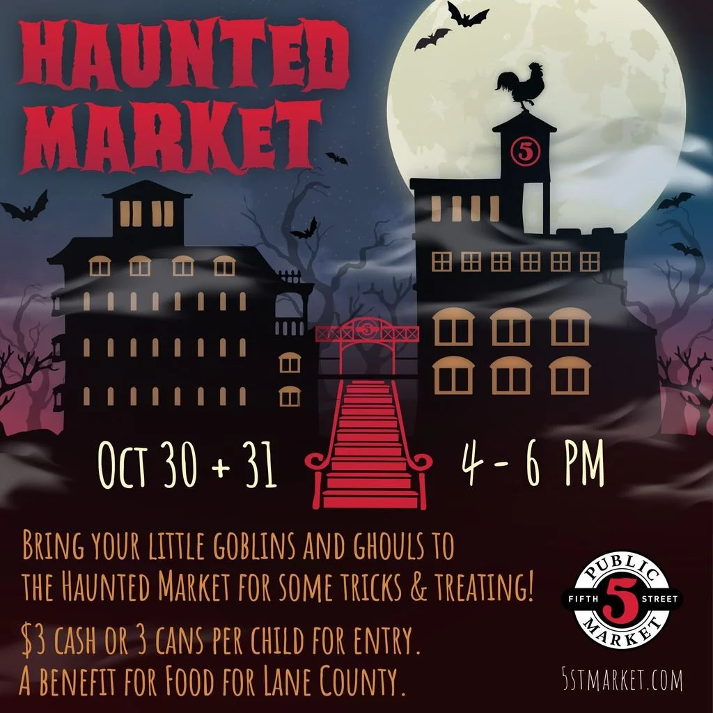Join us for trick-or-treating throughout the 5th Street Public Market! Haunted Market serves as a benefit for FOOD For Lane County, as a $5 cash or canned goods donation is suggested to participate.