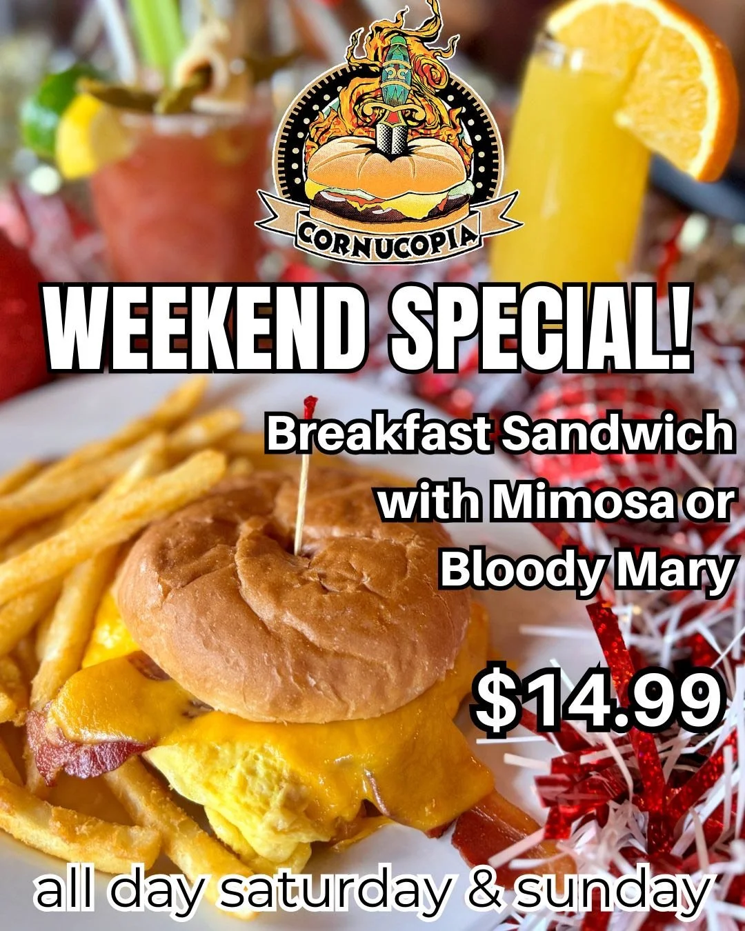 Cornucopia is serving up the perfect weekend treat! Their popular breakfast sandwich & comes with your choice of a mimosa or a Bloody Mary — all for just $14.99.