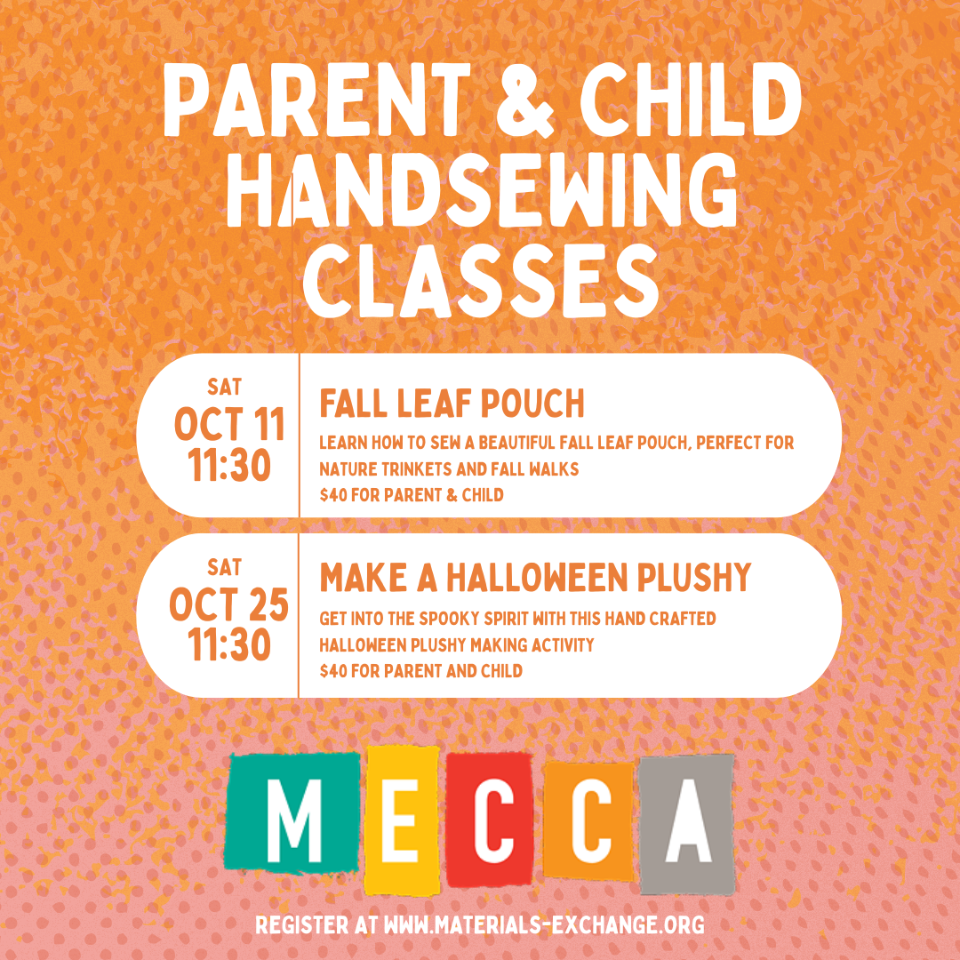 Parents & littles are invited to join MECCA for Saturday morning crafting! On October 11th you can learn to sew a fall leaf pouch. And on the 25th, get into the Halloween spirit as you make a cute + spooky plushy.